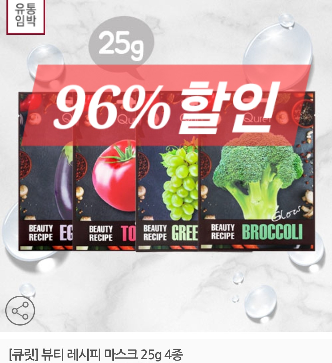 그러다 이유몰에서 [큐릿] 뷰티 레시피 마스크 25g 4종을 96% 할인 가격으로 판매하고 있는 걸 보고, 부담 없이 사용해 보기 괜찮겠다는 생각이 들어 구매하게 됐어요.